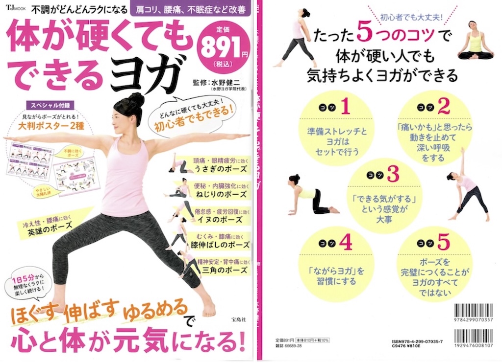 宝島社から出版された雑誌版「体が硬い人でもできるヨガ」です。手軽に床に置いて、見開きで写真が見えるために、好評です。500円と廉価版ですが、中身が濃い内容です。今は手に入らないかもしれませんが、古本屋、ネットで探してみてはいかがでしょう。