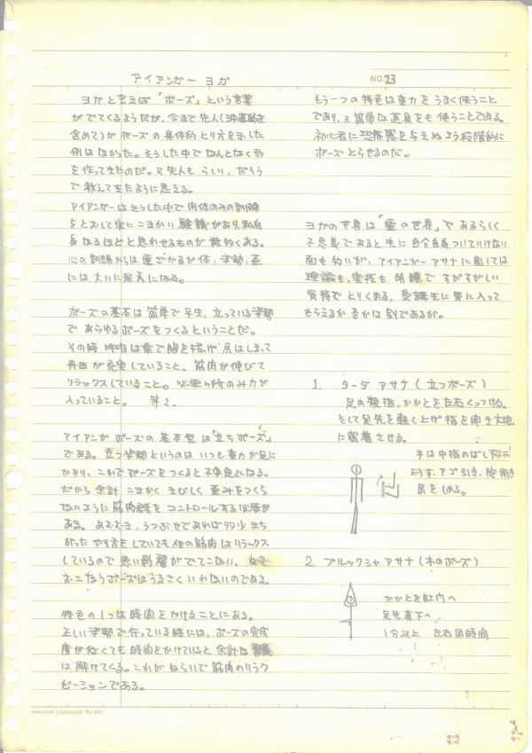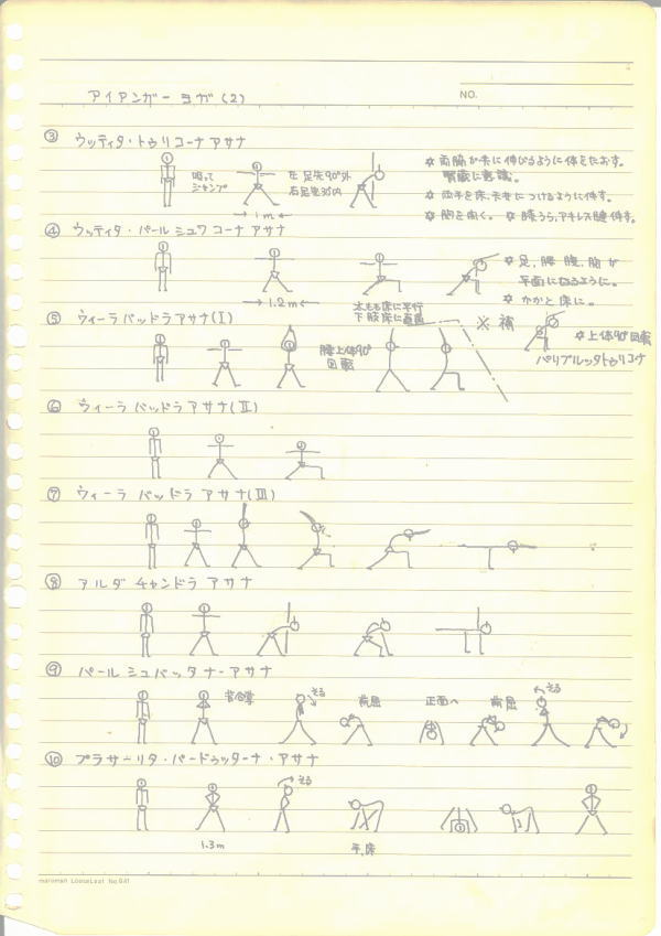 しかし私はこのような指導はしないしできない。形だけはまねることはできるがそれは単なるスパルタ指導・拷問である。師の芸術的なポーズと理論の裏づけがあるから皆が励んだ記憶がある。師は補助道具をよく使った。壁、イス、ベルト、棒、ブロックなどを使って難度の高いポーズを易しくして、姿勢と筋肉の使い方を正した。これだけは教室に備えている。