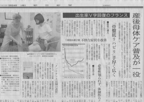 息を腹に吸うとき、横隔膜が下がっておなかの中が加圧されると骨盤底筋も膨らむ。吐くときはこの筋肉が締まり横隔膜が緩む(緩んで肺を加圧する)のに役立っている。骨盤底筋の動きを観察するにはうつ伏せでお尻周りのふくらみを感じるとよい。吸うときふくらみ、吐くときしぼむ。この骨盤底筋が弱くなると骨盤内臓器(泌尿器、生殖器、消化器の一部)に不都合が出てくる。内臓が垂れ下がって脱内臓になる。それについては新聞に書いてあったので参考にしてもらいたい。この記事はフランスで母体ケア(骨盤底筋強化など)をすることで出生率が回復したというものだ。(拡大可)