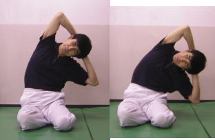 それでは正座をしてから尻を右へ落として横座りをする。そして手を頭の後ろで組んで肘を張って左へ倒す、曲げる。右脇がストレッチされる。力入れたり、我慢したりするとそれはストレッチ体操になる。